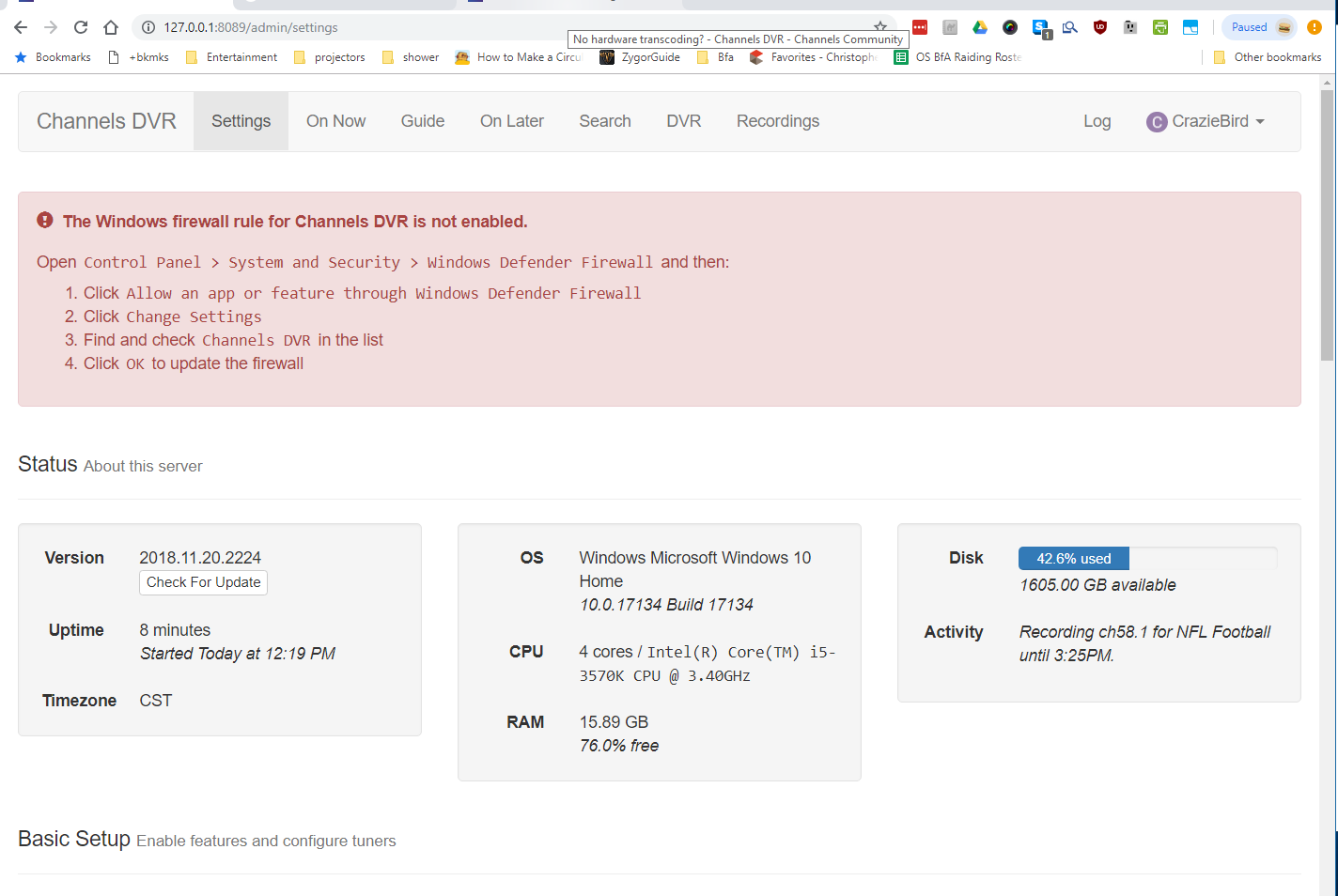 I was trying to fix the fact that i couldnt connect out of the home and was following a post that said to delete channels dvr in the firewall settings and readd it. I did that and now i can not record or watch from my home and the setting pages says " The Windows firewall rule for Channels DVR is not enabled"