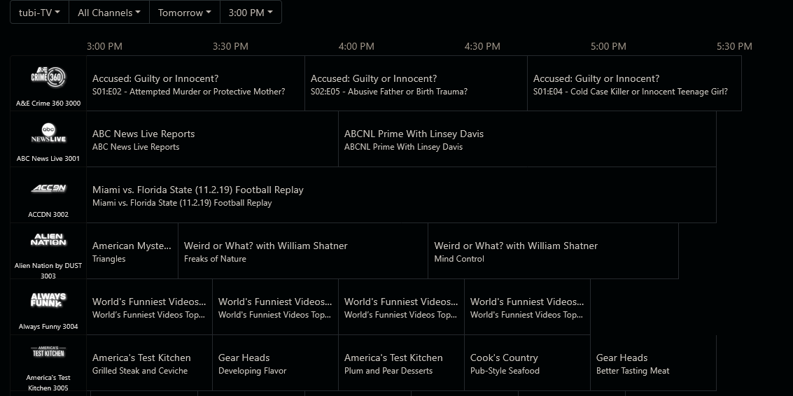I'm seeing that channel with the same guide data on both Tubi and Samsung sources.