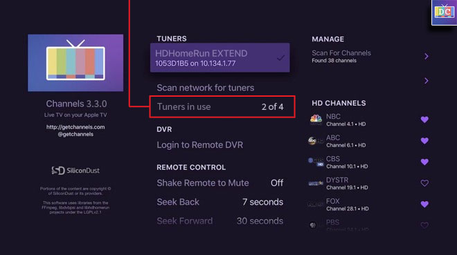 In the Tuners section of the app (all platforms), a simple section that tells you how many tuners are currently in us (live TV and currently recording) and how many tuners in total exist on the network. So in the pictured example, 2 tuners in total are in use and since the only model on the network is a single Extend, the app knows that counts as 4 total tuners, hence 2 of 4. If the setup was, say, two Extends and a Prime 3-Tuner, the same scenario would read 2 of 11, etc. Having it displayed on screen, especially for families, would be great rather than playing a guessing game or checking my.hdhomerun.com.