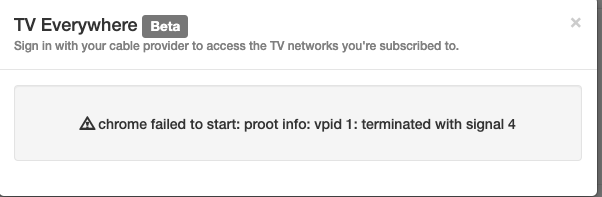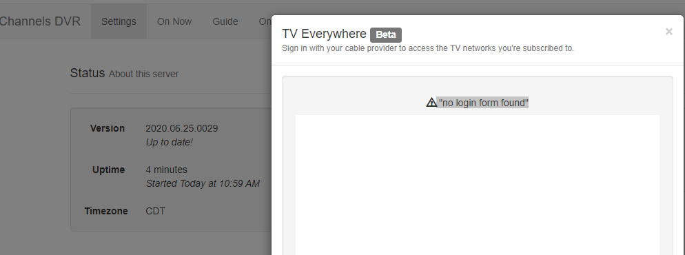 I just updated my Synology 214 NAS to the latest Channels software (2020.08.06.1811) and get this error when I try and add my cable login to TVE: