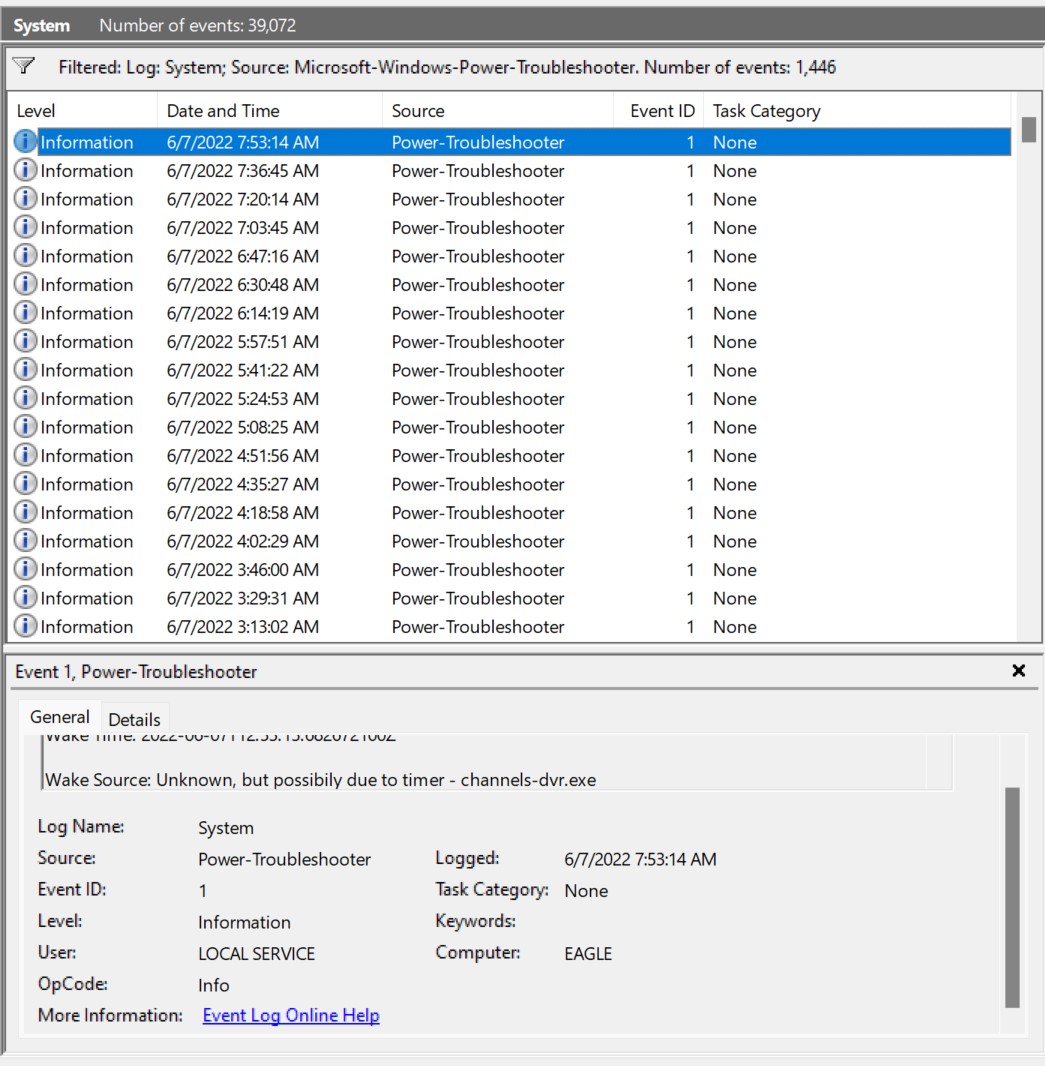 I'm running Channels DVR on my Windows 11 desktop PC. I only record a few shows per week, so I want the PC to sleep when not in use. Channels is waking up the PC from sleep every 16 minutes even with "No upcoming recordings scheduled."