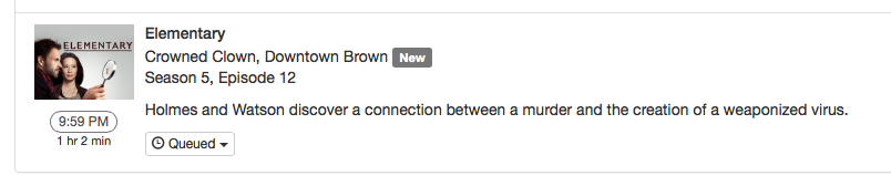 I've uploaded screenshots of the web guide to passes for Elementary, which shows one airing in the expanded view, and nothing on the collapsed view.