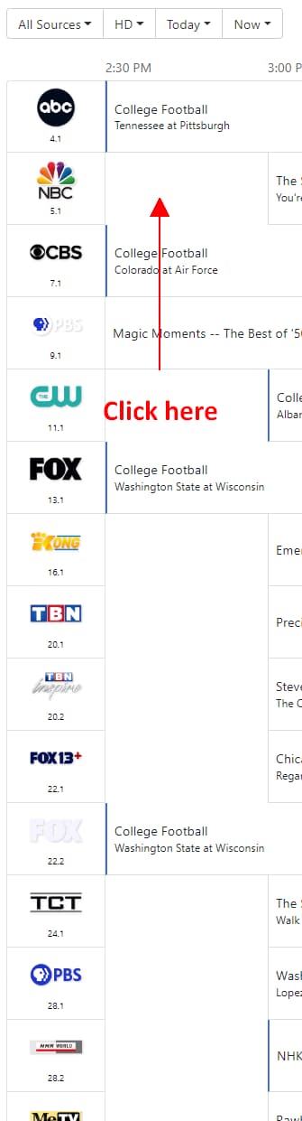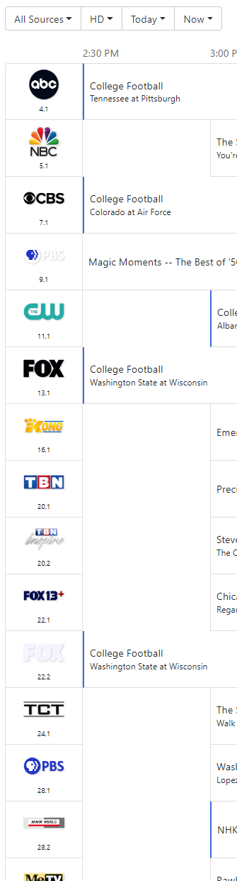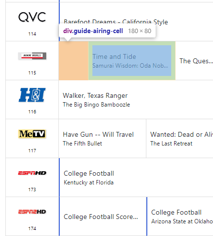 From the web guide it seems impossible to tune channels that have shows that end soon, because the guide data is not shown. See the screenshot. How do I tune 5.1 right now? If I click on the channel name, I get a list of shows coming up soon. If I click on the show that begins at 3:00 pm, I'm given the option to record that show. Which raises two questions, what's playing now on that channel, and how do I tune to that channel? This often happens when I haven't recorded something, but want to start watching the broadcast (e.g. local news). Is leaving out the guide data on the grid for shows ending soon intentional?