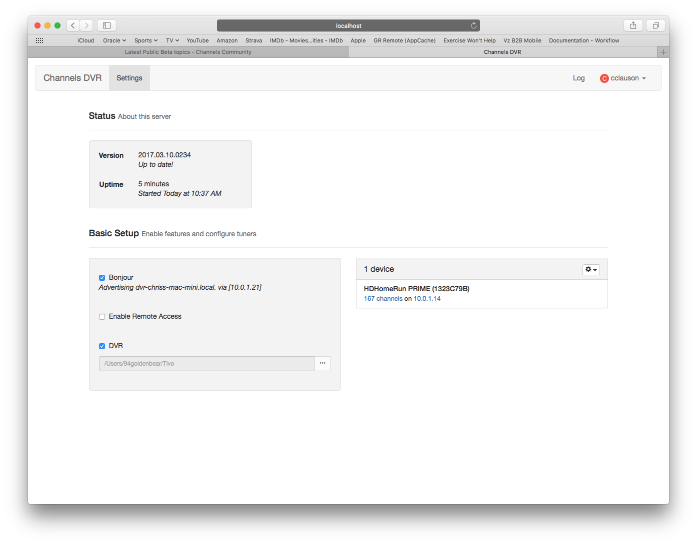 Hello. I tried this on a MacBook Pro initially to check it out, and it worked great. I uninstalled on the MBP and installed on a Mac mini in my media cabinet. It installs fine and everything looks good, except I'm not getting the same tabs across the tab in the configuration page in my browser, e.g., Guide, DVR, Recording, etc. When I open the Channels ATV app the DVR tab instructs to go to the same page to configure, but I'm at a loss. I tried restarting and reinstalling the ATV app + restarting the ATV.