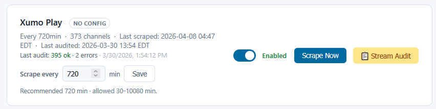 Also, it looks like XUMO offers EPG for at least a couple days (did not try to scroll to end on their website), so it might be possible to modify to check several future dates to be able to give an extended EPG.