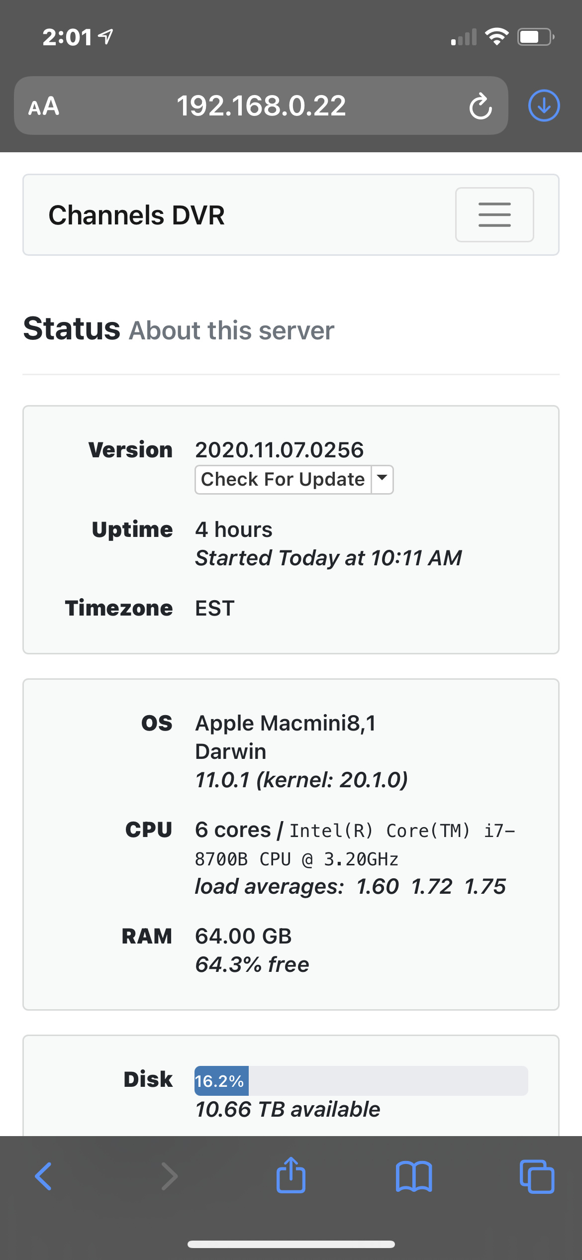 Mac mini Server, Channels DVR ver. 2020.11.07.0256 running seemingly correctly on Mac mini server